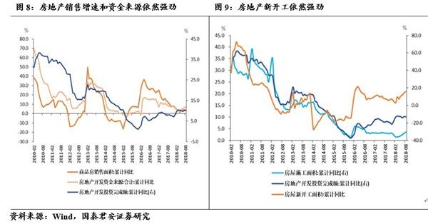 房地产:房地产投资的领先指标(如新开工、开发资金等)表现强劲,将支撑房地产投资至今年四季度,甚至到19年1季度。