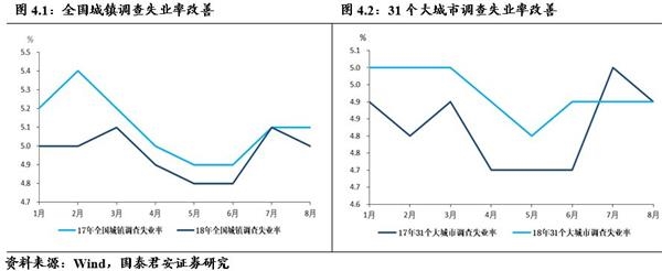 与工业增加值的小幅回升一致,本月失业率有所改善。全国整体调查失业率和31个大城市调查失业率均下降0.1个点。全国调查失业率低于去年同期0.1个点。