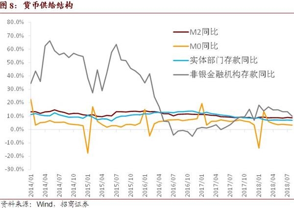 对于非银金融机构而言,我们认为,观察流动性资产充裕与否的关键指标是其存款余额的同比增速。我们在这里选取计入M2的非银金融机构存款,数据显示,其同比增速自2017年年初以来震荡上行;结合负债数据,说明从2017年二季度前后,非银金融机构面临的流动性压力开始边际减弱。我们在图8中对货币供给进行了拆解,数据显示,2017年9月以来,非银金融机构存款余额同比增速大多超过M2,显示去金融机构杠杆对M2的负面拖累已经基本消失。8月非银金融机构存款余额同比增速明显低于7月,但仍保持在两位数,结合其他数据,我们认为非银金融机构自2017年二季度基本上已经进入到主动去杠杆状态。