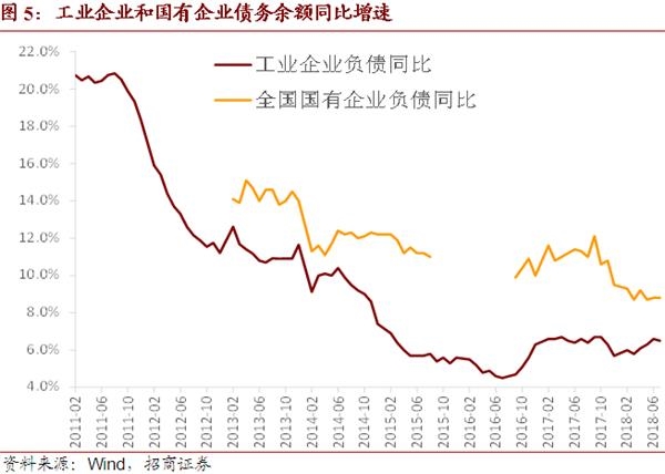 在分析非金融企业时,我们建议将其分解为两个部分:一是市场化程度比较高的部分,可以用工业企业数据进行较好的拟合;二是僵尸企业,所谓“僵”指的是负债对于盈利的反应僵化,可以用国有企业数据进行较好的拟合。图5的数据显示,本轮工业企业去杠杆始于2011年中期,其债务余额同比增速从2011年中的20%降至2016年7月份的4.5%,有比较明显的出清。而随着供给的减少,2016年初工业企业盈利开始持续好转,并引发了此后杠杆的增加,2017年4月工业企业负债同比增速升至6.7%;在工业企业加杠杆的过程中,伴随着制造业投资和民间的恢复,对中国经济形成了一定程度上的支持。但最新的数据显示,2017年4月至今,工业企业加杠杆似有触顶回落的迹象,这与2017年一季度其盈利见顶相符。2018年7月工业企业利润同比增长16.2%,低于前值20.0%;虽然工业企业利润率和毛利率均是2011年以来同期的最高水平,但资产周转率是2011年以来同期的最低水平。从负债的角度,7月工业企业负债余额同比增长6.5%,略低于前值6.6%。根据现有的数据,我们认为PPI同比增速后续将继续震荡下行,与此相应,工业企业利润将边际恶化,进一步扩表动力有限。对于国有企业而言,2013年有数据至2017年11月之间,剔除掉一段不可比的部分,其债务余额同比增速在绝大多数时间里稳定在10%-15%之间,2017年底以来,该数据出现明显下降,7月末降至8.8%,仅略高于历史最低水平(8.7%)。若该数据在未来继续下行,我们则相信本届政府在第二任期内,在去僵尸企业杠杆和国有企业改革方面,会有一些实质性的推进,对照工业企业数据,国有企业负债同比增速或需降至5%左右才能实现出清。也就是说,至少在未来半年左右的时间里,非金融企业中市场化程度比较高的部分难言加杠杆,僵尸企业会去杠杆,合并来看,非金融企业就是去杠杆的状态。关注由此带来的信用风险释放和信用利差重估,事实上2017年底以来,中国的信用利差逐步恢复了与10年国债收益率逆向相关的正常走势,为4万亿之后首见。