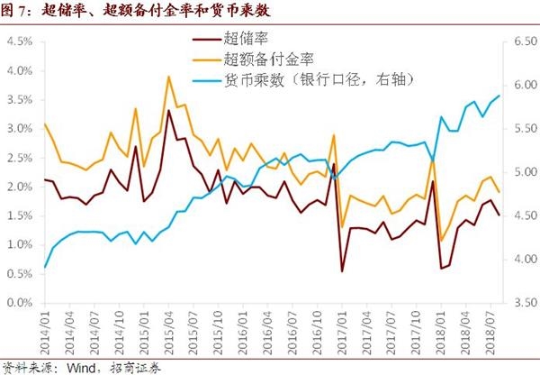 我们再来看金融机构的资产端,一般而言,在流动性资产充裕背景下的去杠杆称之为主动去杠杆,对应流动性边际松弛。对于银行而言,我们认为,观察流动性资产充裕与否的关键指标是超额备付金率,其与货币乘数基本保持负向相关关系(除降准形成的干扰之外)。2017年以来,除年末季节性因素外,超额备付金率仅在今年6月突破了2%(2.1%),结合其他数据,该月货币政策有实质性放松,但对于实体部门传导不畅,7月随即开始转向边际收紧,在降准0.5个百分点的背景下,仅上升0.1个百分点至2.2%,8月则再度跌至2%以内(1.9%)。与此相应的数据是,8月银行超储率录得1.5%,低于前值1.8%;8月货币乘数录得5.88,高于前值5.80,再创历史新高。目前而言,实体部门去杠杆背景下,其存款余额同比增速持续下行;与此相应,银行超额备付金消耗的压力大体上会趋于减轻。央行未来或继续用降准对冲基础货币回笼,货币政策也仍然配合去杠杆的导向,货币乘数或仍面临上行压力。