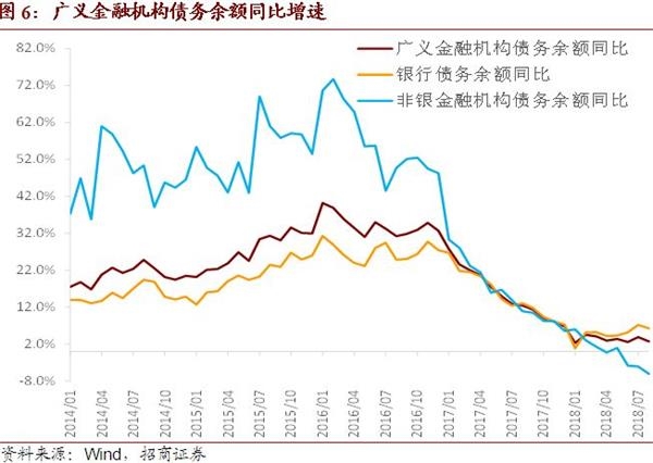 我们对第一部分中金融机构的债务口径进行拓展,截止8月末,广义金融机构债务余额101.7万亿,同比增长2.7%,低于前值3.9%,如果该数据未来能够保持在3%左右的低位,不再进一步大幅下行,那么我们有关金融去杠杆基本结束的判断仍然有效。其中,银行债务余额74.8万亿,同比增长6.2%,低于前值7.2%;分结构来看,对其他存款性公司负债同比降幅扩大;对央行负债同比上升4.8%,前值同比下降2.7%,其他负债增速均较为平稳。非银金融机构债务余额26.9万亿,同比下降6.0%,前值同比下降4.1%。