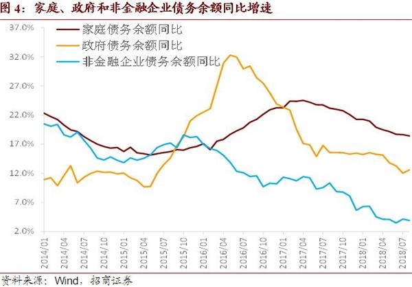具体来看,8月末,家庭债务余额44.9万亿,同比增长18.4%,低于前值18.6%;家庭杠杆水平在2017年4月份见顶后单边回落,去杠杆方向未变,对应房地产数据表现难言乐观。从现有数据分析,去家庭部门杠杆可能是一个较为长期的过程。8月末,政府债务余额51.2万亿,同比增长12.6%,高于前值12.0%;现有高频数据显示,9月该数据大概率不会继续上行,对应基建难有发力以及货币政策不会大幅放松。8月末,非金融企业债务余额113.6万亿,同比增长3.9%,高于前值3.8%;从现有数据分析,到2019年中附近,非金融企业会持续杠杆去化,但空间不大。