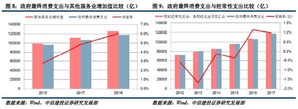 第二种思路是,根据财政支出规模的固定比例估测。这一思路的前提是,政府最终消费支出与公共财政支出的比例关系较为稳定。现实中,2009-2015年这一比例持续回落,2016-2017年又逐年回升,比例关系并不稳定(图7)。