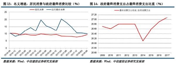 第二,政府最终消费增速较快。最终消费支出的主要构成部分是居民消费支出与政府最终消费支出,占比分别接近60%与30%,是影响最终消费支出增速的主要因素。2014年之后,虽然居民最终消费支出增速基本处于回落通道,但政府最终消费支出增速明显高于居民消费(图13),且在最终消费支出中的占比不断提升(图14),对最终消费支出增速构成支撑。但是这在社零统计中无法体现。