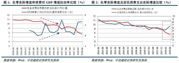 再具体到今年以来的情况,除了上述因素之外,至少有另外三个因素加剧了社零与消费的背离。首先,企业社零拖累社零增速回落明显。根据我们之前的估测,社零结构中企业社零的占比可能接近60%,在去杠杆、紧信用的背景下,企业不仅压缩投资,而且压缩日常费用开支,导致企业社零回落明显。其次,居民消费支出增速在持续多年下滑之后拐头向上。考虑到居民消费支出在最终消费支出中占比接近60%,这无疑会提升最终消费支出对GDP增速的拉动率。至于居民消费支出增速缘何回升,目前尚不清晰,而且这里又存在另一个背离:居民消费支出与可支配收入增速在2017年之后显著背离。最后,最终消费支出在GDP的份额具有明显的季节性特征,通常年初较高。这主要是因为,受春节假期影响,投资活动在一季度有所抑制,而消费在春节期间反而较高,导致一季度最终消费支出在GDP的占比通常为全年最高。从累计增长的角度看,二季度之后最终消费支出占比将逐步回落,映射到最终消费支出对GDP的拉动率上,就是通常年初有季节性抬升。