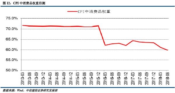 第一,居民服务消费增速较快。目前的居民消费支出分项标准跟CPI分项基本一致,均包含了食品等8大类,其中多数项目同时包含了商品与服务项,难以拆分为消费品与服务项,这样难以获得商品消费与服务消费增速。一个可替代的检验思路是,利用CPI增速数据估测居民消费中的商品和服务权重。但需要注意的一点是,2016年统计局对CPI分类标准与基期进行过调整,当年的CPI消费品权重较2015年之前大幅回落近10个百分点。这既是因为在调整中加入部分新的服务分项(如“养老服务”和“金融服务”),同时也反映了从2011-2015年消费结构中服务占比提升这一变化(2011-2015年使用的是2010年权重,在这一期间几无变化)。由于这一变化,2016年跟2015年的权重不能直接比较。从2016年之后的情况看,CPI中消费品权重在经历短暂回升后,从2017年开始持续下滑(图12),反映这段时间居民服务消费比商品消费增速更快。