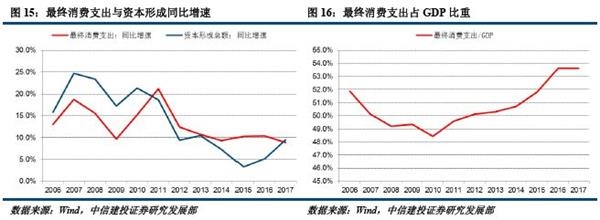 第三,GDP中最终消费份额的提升。最终消费支出(资本形成)对GDP增速的拉动率等于最终消费支出(资本形成)实际增速与基期占比的乘积,因此,最终消费支出(资本形成)在GDP中的份额变化也会影响其对GDP增速的拉动率。近年来,最终消费支出增速要明显高于资本形成增速(图15),导致GDP构成中的最终消费支出占比提升(图16),也有利于提升其对GDP增速的拉动率。