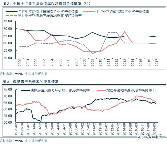 尽管总体来看,全国国有企业杠杆率在平稳下降,然而从结构上来看,主要是煤炭和钢铁行业资产负债率修复较为突出。两个行业得以降低杆杆率的原因在于:首先,外部因素表现在国家大力推行供给改革的背景下,钢铁和煤炭行业去产能任务提早完成。2016 年2月,国务院出台《关于钢铁行业化解过剩产能实现脱困发展的意见》,明确表示用五年时间退出粗钢产能1亿-1.5亿吨。对于煤炭行业,从2016年开始,用3至5年的时间,再退出产能5亿吨左右、减量重组5亿吨左右。从近两年的成效来看,这两个产业去产能效果较好:钢铁化解了产能1.2亿吨,煤炭化解了产能5.4亿吨,均超出了预期。