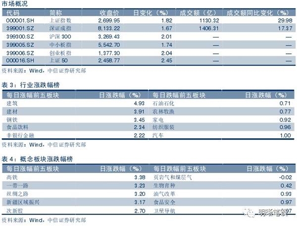 2018年9月18日,银银间质押回购加权利率整体上行,隔夜、7天、14天、21天、1M和3M分别变动了-2.64BPS、0.25BPS、3.04BPS、5.83BPS、0.26BPS和1.03BPS至2.45%、2.62%、2.66%、3.06%、3%和3.15%。当日国债收益大体上行,1年期、3年期、5年期、10年期国债分别变动1.57BPS、-0.15BPS、1.26BPS、1.25BPS至2.88%、3.36%、3.49%、3.65%。上证综指收涨1.82%至2,699.95,深证成指收涨1.67%至8133.22,收涨2.04%至1,377.30。