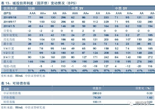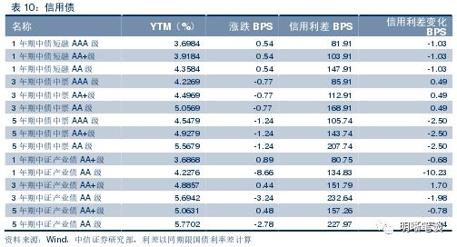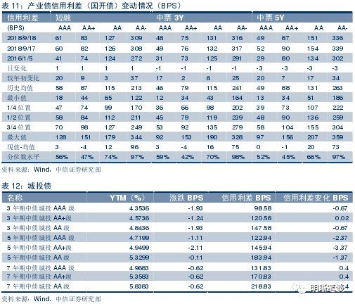 9月18日,债券收益率长、中端下行,短端上行。其中AAA中票1Y上行1BPS,3Y下行1BPS,5Y下行1BPS;AA中票1Y上行1BPS、3Y下行1BPS、5Y下行1BPS;AA-中票1Y上行1BPS、3Y下行1BPS、5Y下行1BPS。