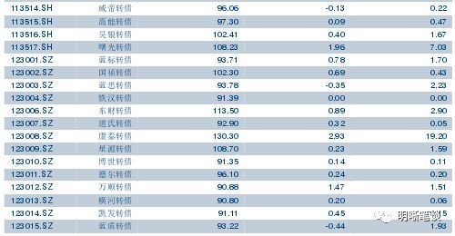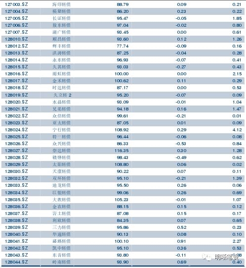 9月18日转债市场,平价指数收于79.19点,上涨1.05%,转债指数收于101.55点,上涨0.34%。93支上市可交易转债,除铁汉转债停牌外,60支上涨,32支下跌。其中康泰转债(2.93%)、曙光转债(1.96%)、万顺转债(1.47%)领涨,泰晶转债(-0.60%)、众兴转债(-0.53%)、赣锋转债(-0.49%)领跌。93支正股,除天康生物、ST辉丰、广汽集团横盘,铁汉生态停牌外,84支上涨,5支下跌。其中,道氏技术(5.53%)、航天信息(4.85%)、金禾实业(4.19%)领涨,威帝股份(-0.70%)、骆驼股份(-0.36%)、嘉澳环保(-0.24%)领跌。