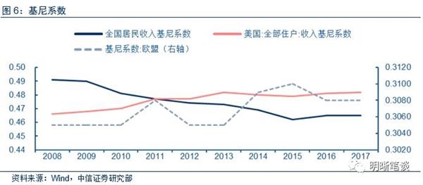 基尼系数维持在高位导致消费增速下滑。虽然基尼系数从08年以来一直延续下行趋势,并在2011年前后降低到美国之下,从0.49下降到0.46附近,但相比于其他经济体如欧盟仍然保持在较高位。基尼系数较高意味着收入分配的差距过大,这将影响整体消费的提升。收入分配差距过大包括两类:第一类是东中西部之间,经济发展水平差别带来的不同地区之间收入差距;第二类是在区域内部,要素占有、受教育程度不同等原因造成的区域内部收入差距。