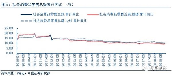 短期来看,消费存在的问题主要是累计同比不断下行。从2010年1月到2018年8月,总体社零累计同比一路下滑从20%左右的增速一路下滑道10%左右,呈现出不断下行的趋势。城镇与乡村社零的累计同比增速与总的社零累计同比增速保持相同的趋势。社零是消费的代表性指标,社零累计同比的下滑意味着消费的下滑。消费增速在GDP增长中占据相当大的比重,因此我们需要对社零同比增速的下滑保持足够的警惕。