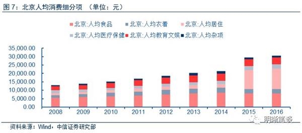 消费细分项目如房租支出占比较高影响社零增速,阻碍消费。以北京为例,从2008年到2016年北京的人均消费金额在不断上升,消费水平在不断提高。从细分项来看,食品一直以来都占据较大比重,15年以前人均教育文娱是仅次于食品消费的第二大板块,但15年开始由于居住支出占比突然上升,限制了包括教育文娱在内的支出。由于社零并不包含房租,因此房租支出增速的上升并不影响社零增速。而且由于房租支出占比过高严重的限制了其他消费项目的支出,不利于消费结构的优化。更有甚者,房租限制了食品、医疗、教育等的支出将会对劳动力的再生产产生影响,进而影响未来的消费水平。
