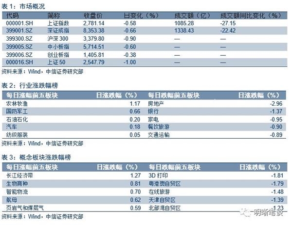 2018年9月25日,银银间质押回购加权利率大体下行,隔夜、7天、14天、21天分别变动了-0.32bps、-0.55bps、-1.93bps、3.82bps至2.51%、2.64%、2.85%、3.12%。当日国债收益大体下跌,1年期、3年期、5年期、10年期国债分别变动0.05BP、-2.65BP、-0.77BP、0.02BP至3.03%、3.32%、3.50%、3.68%。上证综指收跌0.58%至2781.14,深证成指收跌0.66%至8353.38,收跌-0.38%至1405.81。