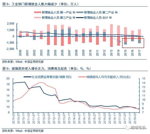 长期来看,新增就业的人数大幅下降导致城镇居民收入增长乏力,进而影响消费提升。2013年起,由于经济下行压力以及供给侧去产能等影响第二产业就业人数不断减少甚至转负增长,第三产业就业人数也不断下行,新增就业人数不断走低。这直接或者间接导致了城镇居民人均可支配收入的同比呈现不断走低的趋势。受到收入同比下行的影响,社会消费品零售总额同比增速也不断走低,消费增速受到影响。