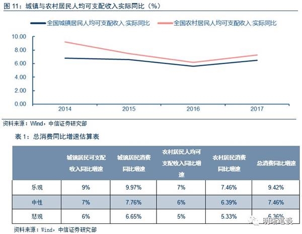 2。乐观状态下,城镇居民可支配收入同比增速为9%,农村居民人均可支配收入同比增速为7%;悲观状态下,城镇居民可支配收入同比增速为6%,农村居民人均可支配收入同比增速为5%;中性状态即为城镇、农村居民可支配收入实际同比中枢增速。
