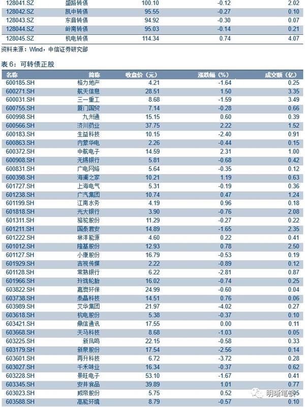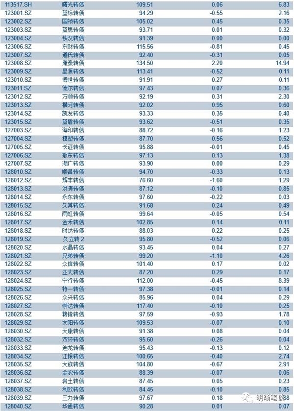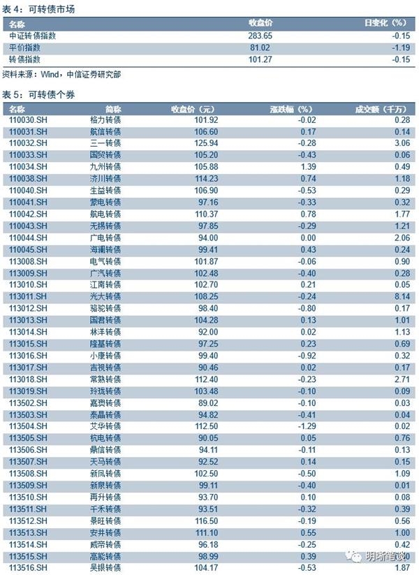 本周二沪深两市同向变动,尾盘上证综指下跌0.58%,下跌0.66%。上周转债市场受情绪边际修复拉动中证转债指数录得不小涨幅,但指数上涨的背后主要来自于权重银行标的不俗表现,其余多数标的实则乏陈可善,成交量也并未出现明显上升趋势。转债指数今年至今基本收平表现优于正股,个券表现分化进一步趋严,而上周股票市场开启放量反弹,市场整体情绪有所修复,但此边际改善短期还需一定时间传导至转债市场,因此我们站在当下时点从转债市场内生指标出发对四季度进行展望。三季度我们建议投资者可以更有耐心维持中性仓位,其背后的核心原因一方面来自于正股市场的持续波动,另一方面来自于转债自身偏高的转股溢价率,前期溢价率处于目标区间内具备充足短期弹性的个券数量一直维持在低位,且不少个券绝对价格偏高并未给投资者提供太多布局机会,而伴随着上周市场的修复,不管是整体股性估值还是满足目标区间的个券数量都有所改善,为四季度转债表现提供支撑。与此同时,转债整体绝对价格也维持在相对低位,在存在提前赎回线这一天然天花板的大背景下后市绝对涨幅空间充足,债性估值也于上周出现触底反弹迹象。另一方面,三季度受正股持续调整影响不少转债标的发布下修预案,其中也出现预案在股东大会上被否的案例。上周兄弟转债也大幅下调转股价,但从三季度下修转债的表现来看投资者对条款博弈的参与度有所降低,这也符合我们一直强调的条款博弈存在较高不确定性不需过度关注的观点。综合来看,我们对转债市场四季度多一分乐观,其背后主要包括三方面原因:一是股票市场的起稳、市场风险偏好有所修复,二是转债估值较前期有所改善,三是仍有不少正股资质较优的公司即将发行新券,为市场提供更多机会。落地至策略层面短期内整体策略上依旧无需冒进,具体仓位高低还需进一步观察弹性标的数量。但鉴于市场情绪有所回暖,边际上可以更加积极有为,值得一提的是当下流动性是重要的考量因素之一,因此大银行转债不失为主要的配置标的。四季度来看建议持续关注市场的获取beta的机会以及受益于研发费用加计扣除比例提升的相关板块个券。择券层面建议关注转股溢价率处于目标区间内标的以及新上市个券;具体标的建议关注三一转债、崇达转债、景旺转债、机电转债、新凤转债、安井转债、新泉转债、艾华转债、国祯转债、星源转债以及银行转债。