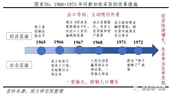 1965年,新加坡被迫脱离马来西亚联邦,分离贸易大幅减少;1968年英国撤军,2.5万个受雇于英军基地的新加坡工匠、职员、厨师和佣人失业,此时的新加坡面临着国内市场太小、就业机会缺乏、工业发展落后等一系列问题,失业、贫困、住房短缺成为危害新加坡社会稳定的三大毒瘤。时任财政部长的林金山表示,“采取财政措施鼓励出口导向工业,在吸引外资的同时还要求其具有市场开拓能力”,新加坡自此开始了第一次工业革命。经济层面,以出口导向替代了自治初期的出口替代政策,并采取一系列措施主动吸引外资;社会层面,为控制人口过快增长导致的高失业率及住房短缺问题,1966年开始推行计划生育。在这一阶段(1966-1973),新加坡经济迅速崛起,GDP从33.5亿新元增长210.1%至103.9亿新元,出生率从4.66%迅速降至2.79%,失业率从8.9%降至4.43%,基本实现充分就业。