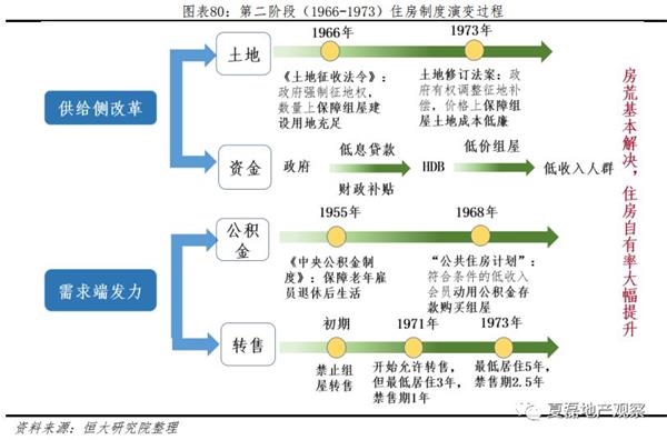 1964年推出“居者有其屋”计划,开始以低价向中低收入家庭销售组屋。独立之后的新加坡,面临印尼排华冲击、马来西亚种族冲突等一系列危机事件,华人为主的新加坡开始组建军队,新加坡政府意识到“有恒产者有恒心,只有在新加坡有了不动产,军队和士兵才会为了保护自己的财产而战”。故在1964年,时任总理的李光耀提出“我们的新社会,居者有其屋是关键”,自此掀开了新加坡住房自有的序幕,HDB的供应模式也从租赁逐渐转向销售。“居者有其屋”计划的提出,其初衷是由政府向中低收入家庭提供符合购买力的公共组屋,从而让公民自有资产并享受国家建设的增值收益,促进经济、社会和政治稳定。