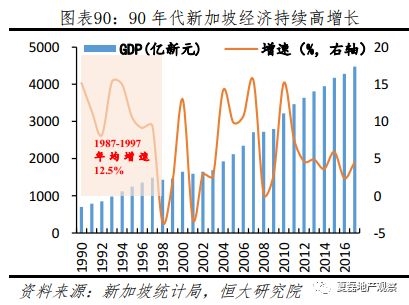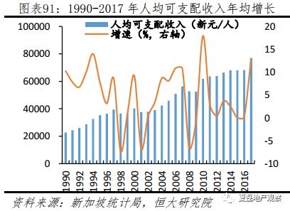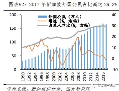 新加坡经济在90年代持续高增长,并在1995年跻身“发达国家”队列,吸引大量国际人才。97年亚洲金融危机以前的十年,新加坡GDP保持两位数增长,年均增速高达12.5%,98年受金融危机影响增速放缓,但很快又恢复增长。2017年,新加坡GDP高达4472.8万亿新元。人均可支配收入从1990年的22655.8新元增至2017年的76863.4亿新元,年均增速为7.5%。随着新加坡经济的快速发展,大量国际化人才集聚于此,外国公民数量从1990年的31.1万增至2017年的164.6万,在总人口中占比增至29.3%。