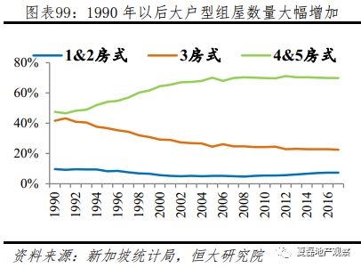 二是增加大户型组屋数量,四房式、五房式数量大幅增加。随着住房短缺问题逐渐被解决,组屋也呈现大型化趋势。第一个五年计划(1960-1965)以一房式、二房式为主,快速供给解决房荒;第二个五年计划(1966-1970)时,住房短缺有所缓解,主要建造三房式和四房式组屋;第三个五年计划(1971-1975)开始拆建和改良一、二房式组屋,进一步扩大建筑面积;第四个五年计划(1976-1980)后不再建设一、二房式组屋,而是大幅增加四房式、五房式组屋供应,满足更多中等收入家庭需求。1990年大户型组屋(四、五房式)占比增至47.6%,占据主导地位。