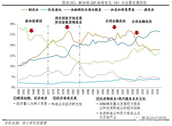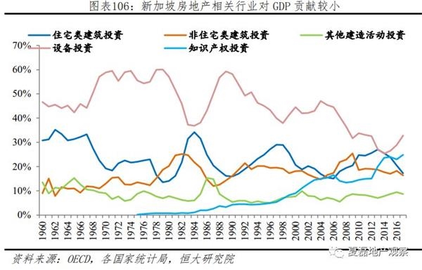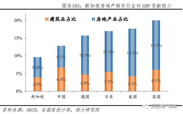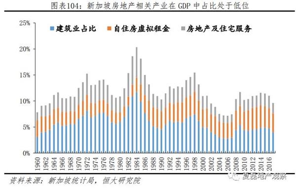 新加坡政府从自治之初就将住房作为一个社会问题,而建立“居者有其屋”的住房制度被看作是维持社会稳定的关键因素,故政府主导的房地产行业是社会福利体系的一部分而非支柱产业。因此,房地产相关行业在主要经济指标中占比始终维持在低位,并不是经济增长的引擎,而支柱产业也随着时代而变迁。