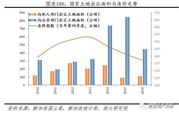 二是控制土地供给数量:新加坡政府往往根据房价涨跌情况调节土地供应,2010-2014年,在房价上涨期间,新加坡加大了土地供给力度,而在2013年第房价开始回落后,面向私人住房市场的土地出让开始收紧。