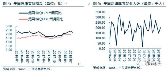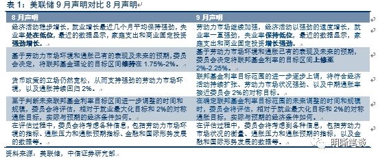 9月加息符合市场预期。美联储声明称“劳动力市场继续加强,经济活动以强劲的速度增长”,就业率一直强劲,而失业率一直保持低位,家庭支出和商业固资增长强劲。基于12个月以来的数据,除了食品和能源以外的项目整体通胀率和通货膨胀率都保持在2%附近。总体来看,长期通胀预期指标没有多少变化,预计中期通胀率接近委员会2%的目标。经济前景的风险似乎“大致均衡”。基于劳动力市场环境和通胀已有的表现及未来的预期,本次美联储会议,FOMC委员一致投票决定提高超额准备金率(IOER)为2.20%,同时,上修联邦基金利率至2%-2.25%目标区间内,并将基本信贷利率上调0.25个百分点至2.75%,2018年9月27日生效。值得一提的是,FOMC删除了“货币政策的立场仍然宽松,从而支持强劲的劳动力市场环境,以及通胀持续回归2%”的措辞。