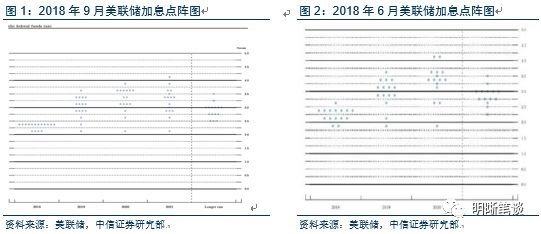 2019年离散的点阵图显示仍有较大分歧,新任美联储副主席或较为鹰派。美联储维持2018年加息四次(重申12月加息预期)、2019年加息三次、2020年加息一次的预期不变,首次公布的2021年点阵图表明2020年之后不会加息,点阵图反映的加息顶点在2020年,虽然2020年与2021年的点阵图离散程度差异较大。更长周期的联邦基金利率中位数(即中性利率)变为3.000%,6月时料为2.875%,上调了12.5个基点。另外,本次会议是8月刚通过国会任命听证的美联储“二号人物”、副主席Richard Clarida的首个FOMC议息会议,对于2019年的预测中,9月份点阵图较6月份点阵图除了两个最低的点有所提高外,还在3.25%-3.50%这个区间内新增了一个点,因此我们推测该点较大的可能是由新任副主席Richard Clarida投出的,即其认为在今年年内还有一次加息之后,明年还将加息四次,观点偏鹰。