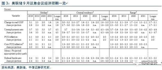 具体而言,美联储上调今年的实际GDP增长预期和今年失业率预期,PCE及核心PCE通胀预期维持不变。本次会议对经济的预期如下:经济增速方面,预测2018年的实际GDP增长率为3.1%,高于今年6月预测的2.8%,预测2019年GDP增长率为2.5%,较前一次预测上调,而预测2020年GDP增长率为2.0%,较前一次预测上调和保持一致,首次公布2021年GDP增长率预测为1.8%;通胀方面,预测2018、2020年PCE通胀率为2.1%,与今年6月预测保持一致,对2019年的预期值为2.0%,较前一次预测下调。预测2018、2020核心年PCE通胀率今年为2.0%、2.1%和2.1%,与6月预测保持一致,首次公布2021年PCE通胀率、核心年PCE通胀率预测为2.1%。就业方面,预计2018年失业率为3.7%,之前预期为3.6%;2019、2020年失业率预测中值均为3.5%,与6月预测保持一致,首次公布2021年失业率预测为3.7%;此次联储官员预测中位值显示,2018年底联邦基金利率料为2.375%(前次料为2.375%),这意味着美联储将年内加息预期上调至四次。此外,2019年底联邦基金利率料为3.125%(前次料为3.125%),2020年底联邦基金利率料为3.375%(前次料为3.375%),2021年底联邦基金利率料为3.375%。