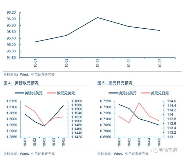 国庆期间,美元指数、英镑兑美元小幅上涨,其他主要货币相应下跌。美元指数从10月1日的95.1308上涨至5日的95.6446;英镑兑美元从10月1日的1.3036上涨至5日的1.3116;欧元等其他主要货币则相应呈现贬值态势。