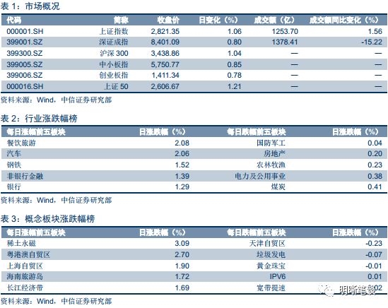 2018年9月30日,银银间质押回购加权利率整体上行,隔夜、7天、14天、21天和1M分别变动了68.45bps、1.27bps、11.86bps、9.56bps和0.7bps至2.72%、2.80%、3.62%、3.53%和3.35%。当日国债收益大体上行,1年期、3年期、5年期、10年期国债分别变动-2.43BPS、0.17BPS、0.52BPS、-0.01BPS至2.97%、3.28%、3.46%、3.61%。2018年9月28日,上证综指收涨1.06%至2,821.35,收涨0.80%至8401.09,收涨0.78%至1,411.34。