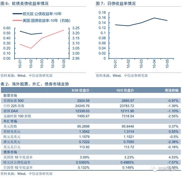 国庆期间,10年期美债、欧债收益率都呈现出先跌后涨的趋势;10年期日本国债收益率创下自2016年以来新高。10年期美债和欧债同时在10月2日达到国庆期间的最低点,此后又开始上升,10年期美债于10月5日收于3.23%,10年期欧债于10月3日收于0.4985%。10年期日本国债收益率在国庆期间保持了升势,从10月1日收盘时的0.1320%上升到10月5日收盘时的0.1490%。