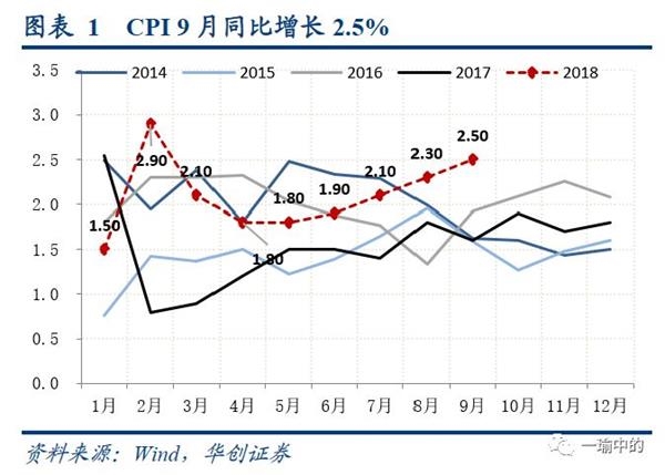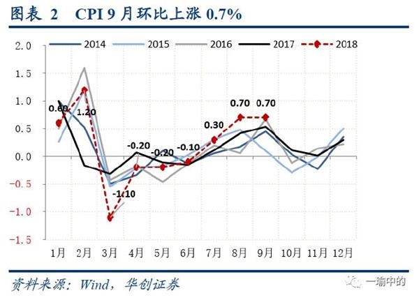 2018年9月CPI同比增长2.5%,环比增长0.7%,同比涨幅扩大,环比持平,且接近历史较高水平(同比过去五年平均:1.85%,环比过去五年平均0.49%)。