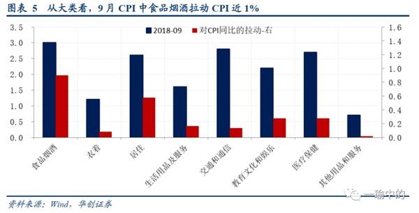 从大类看,食品烟酒拉动作用增长强劲,非食品项中以居住项较为突出。9月食品烟酒同比增长3%,拉动CPI同比0.9个百分点,较上月拉动作用增强超0.3%。居住项同比增长2.6%,拉动CPI 0.6个百分点。值得注意的是医疗保健同比9月大幅度跌落,拉动作用减小。