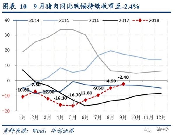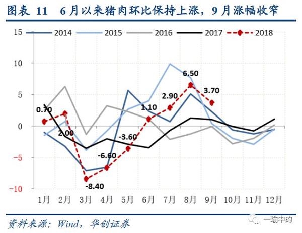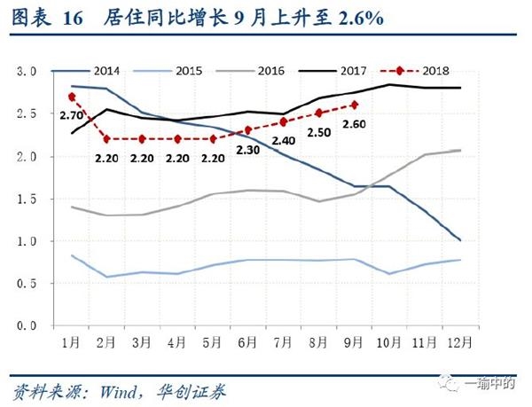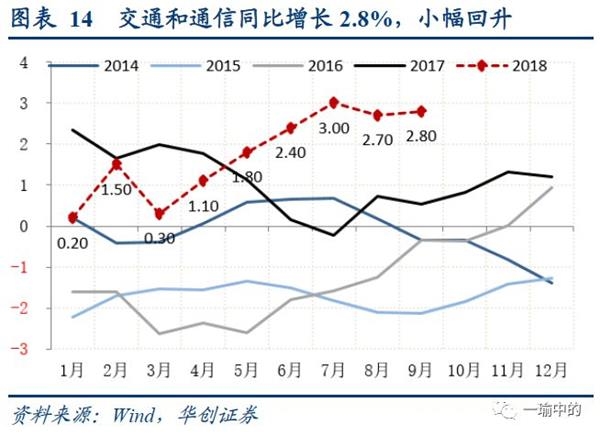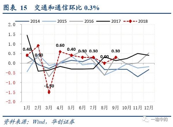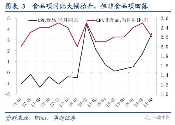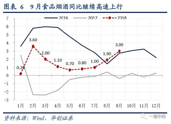 对于食品项,在经历猪肉、蔬菜鲜果7-9月的大幅上涨之后,年内预期食品项同比难从高位回落,且高基数作用将延续到2019年形成翘尾因素,这也是当前对未来经济“滞胀”担忧的主要来源,此外还有贸易战的部分影响。