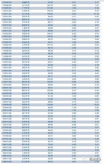 10月16日转债市场,平价指数收于74.10点,下跌1.85%,转债指数收于99.78点,下跌0.42%。94支上市可交易转债,除铁汉转债停牌,机电转债、电气转债横盘外,11支上涨,80支下跌。其中双环转债(0.36%)、隆基转债(0.32%)、特一转债(0.31%)领涨,盛路转债(-2.97%)、崇达转债(-2.28%)、东财转债(-1.82%)领跌。94支正股,除铁汉生态停牌,天康生物、长江证券、海印股份、光大银行横盘外,9支上涨,80支下跌。其中,威帝股份(3.95%)、高能环境(2.34%)、特一药业(2.26%)领涨,航天信息(-10.00%)、金禾实业(-9.23%)、玲珑轮胎(-6.03%)领跌。
