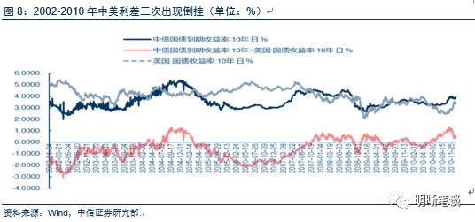 中美利差不光需要分析中债相对于美债,美债自身也很重要。历次利差收窄可以看到,其背后原因不仅是美债收益率走高的驱动,也存在国内利率下降的作用。在我们之前的报告《如何看待目前的中美利差?》中,详细介绍了历史上几次中美利差处于低位或倒挂的情形,因此本文仅稍作梳理,重点分析中美利差倒挂的原因。自2002年起,中美利差波动区间较大,范围从-310BP到127BP,而且在2002到2004年,2005年到2007年及2008年到2010年曾出现过3次中美利差倒挂。2012年11月-2013年7月,美债收益率大幅上行,国债收益率小幅下行,中美利差快速收窄,主要受美债收益率大幅上行的驱动。2015年8月-12月,债市牛市背景下中债收益率下降,美债收益率小幅下行,中美利差收窄。与2012至2013年的情况不同,这一阶段驱动中美利差走势的主要是国内利率。2016年6月-11月,中债美债齐跌,但美债下跌幅度更大,中美利差快速收窄。这一阶段中美利差收窄主要受到美债驱动。