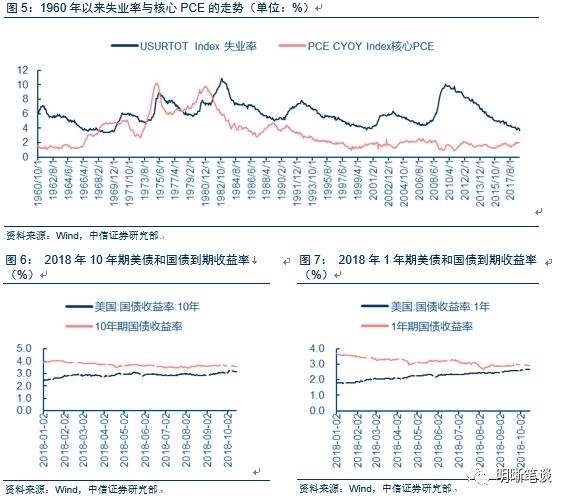 2018年4月前后,在2017年1月美国通胀触顶回落后,在新兴市场与欧洲市场的经济放缓,而美国基本面向好、股市持续走牛的背景下,美国经济的走强带动着通胀的上行,美联储加息节奏也在加快。短端、长端收益率持续走高。