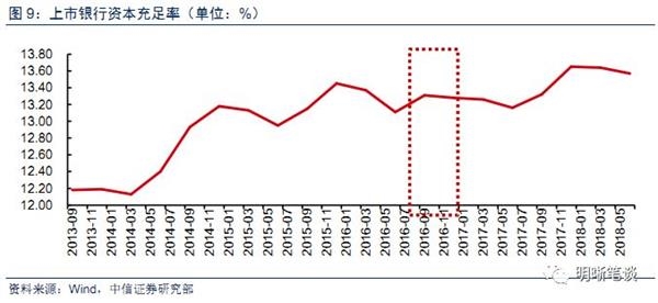 短期内资本补充压力将制约融资环境的改善。至2018年二季度我国商业银行的资本充足率由13.65%下降至13.57%,从上市银行的年报可以看到,24家上市银行中也有半数银行的资本充足率呈现不同程度的下降。对于商业银行而言,改善资本充足率可从增加资本和减少加权风险资产总额的角度入手。而目前我国银行的资本补充工具较为贫乏且由于期限长风险大且流动性较差投资者热情不高,同时非标回表持续风险资产总额增加,未来银行的资本补充压力仍大。