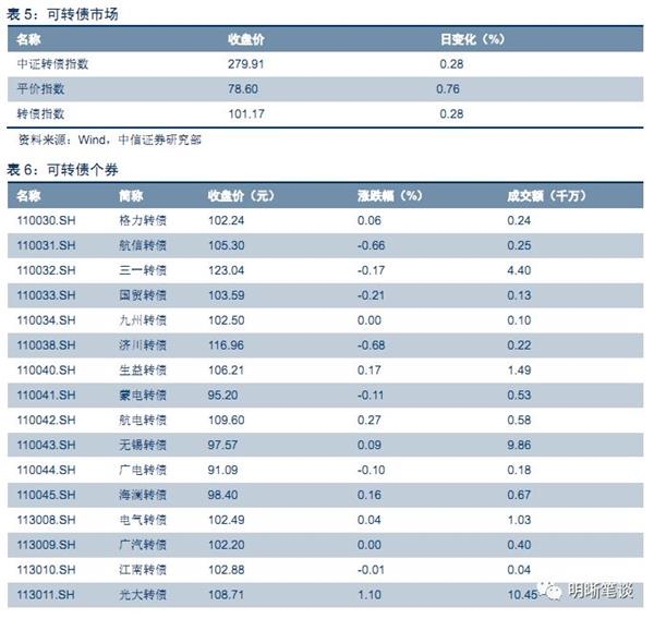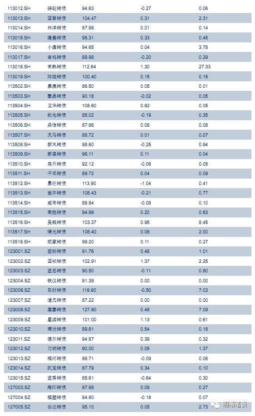 10月24日转债市场,平价指数收于78.60点,上涨0.76%,转债指数收于101.17点,上涨0.28%。94支上市可交易转债,除铁汉转债停牌,众兴转债、众信转债、道氏转债、九州转债、广汽转债横盘外,50支上涨,38支下跌。其中江银转债(2.06%)、国祯转债(1.37%)、常熟转债(1.30%)领涨,景旺转债(-1.04%)、崇达转债(-0.97%)、东音转债(-0.82%)领跌。94支正股,除铁汉生态停牌,双环传动、特一药业、众信旅游、洪涛股份、海印股份、泰晶科技、小康股份、广汽集团横盘外,44支上涨,41支下跌。其中,无锡银行(6.76%)、江阴银行(6.30%)、吴江银行(6.04%)领涨,东音股份(-7.15%)、大族激光(-3.86%)、安井食品(-3.56%)领跌。