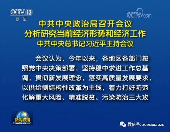 会议认为,今年以来,各地区各部门按照党中央决策部署,坚持稳中求进工作总基调,贯彻新发展理念,落实高质量发展要求,以供给侧结构性改革为主线,着力打好防范化解重大风险、精准脱贫、污染防治三大攻坚战,加快改革开放步伐,实现了经济社会持续健康发展。前三季度,经济运行总体平稳,稳中有进,继续保持在合理区间。居民消费价格基本稳定,制造业投资回升到近年来较高水平,较快增长,利用外资稳步扩大,秋粮获得丰收,居民收入增长与经济增长基本同步,城镇新增就业提前完成全年目标。经济结构持续优化。支持民营经济发展,实施促进金融市场健康发展的一系列措施,提振了市场信心。