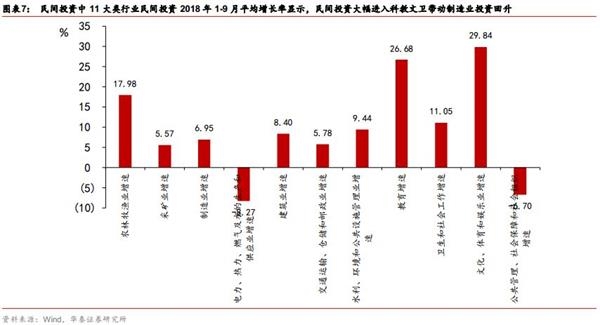 今年以来,民间投资在科教文卫领域快速增长,带动整体民间投资维持高位。今年以来,民间投资持续维持较高增速,1-9月的单月平均增长率超过8.5%,显著高于固定资产投资,其中,科教文卫领域的民间投资快速增长,是推动民间投资整体回升的重要动力。截至2018年10月数据,今年以来,教育业民间投资平均累计同比增速为25.73%,文化体育和娱乐业民间投资平均累计同比增速为30.68%,显著高于整体民间投资。原因在于,我国近年来政策逐步放开,鼓励并支持民间资本进入更多行业和领域,特别是科教文卫这一类以传统政府投资为主导的行业,随着政策的放开,民间资本的投资意愿和积极性被调动起来,投资增速相应出现快速上行,带动了整体民间投资保持较高增速。