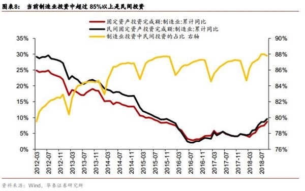 为何民间投资增速与制造业投资增速同步性较强?制造业投资中民间投资的贡献超过85%。由于民间投资增速与制造业投资增速的变动规律相关性很强,业界甚至产生过民间投资是否是制造业投资中的一个分项的疑问?实际上,民间投资中近48%的投资流向制造业,而制造业投资中,超过85%的投资来自于民间投资,如下图所示,随着制造业投资中的关联程度逐步增高,制造业中的民间投资占比从2012年3月的79.48%逐步增长,至2018年9月已达到87.79%,制造业投资累计同比增速与民间投资累计同比增速的趋势越来越吻合,两者之差大幅收窄。