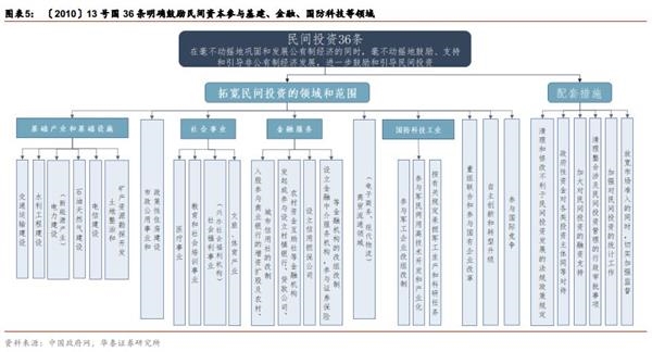 国发〔2010〕13号文在国发〔2005〕3号文基础上,进一步明确了民间资本的准入领域和进入方式。2010年5月,国务院办公厅发布国发〔2010〕13号《国务院关于鼓励和引导民间投资健康发展的若干意见》,该文件对民间资本的准入领域和进入方式进一步地说明和拓宽,在基建、公用事业、社会事业、金融服务、商贸流通、国防科技、国企改革、自主创新等方面进行细致说明。