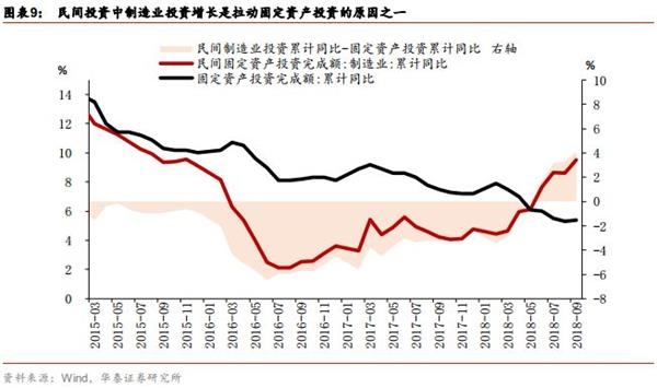 民间投资增长动力较强的主因可能在于四点:政策鼓励民间资本进入科教文卫等传统政府投资主导领域带动民企投资增长,集中度提升背后动能转换带来的幸存者偏差,民企的投资能力较强,以及布局未来民企抢占市场提升投资意愿。由于固定资产投资中超过60%为民间投资,2018年二季度以来,民间投资的回升有效对冲了固定资产投资的下行趋势。我们认为,制造业民企和地产民企的投资增长是拉动固定资产投资回升的核心因素,前者自2018年5月以后快速上行,1-9月民间制造业投资累计同比9.5%;而地产民企今年在拿地、新开工等方面的高增速也拉动固定资产投资回升。