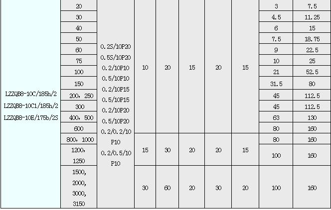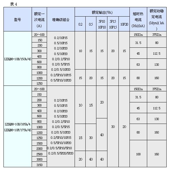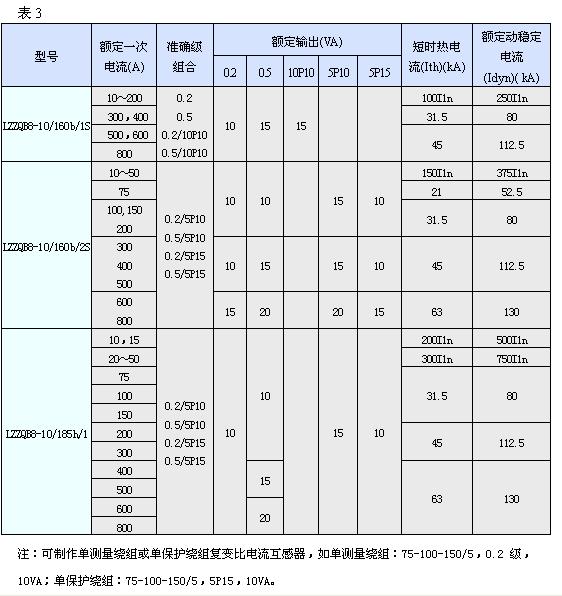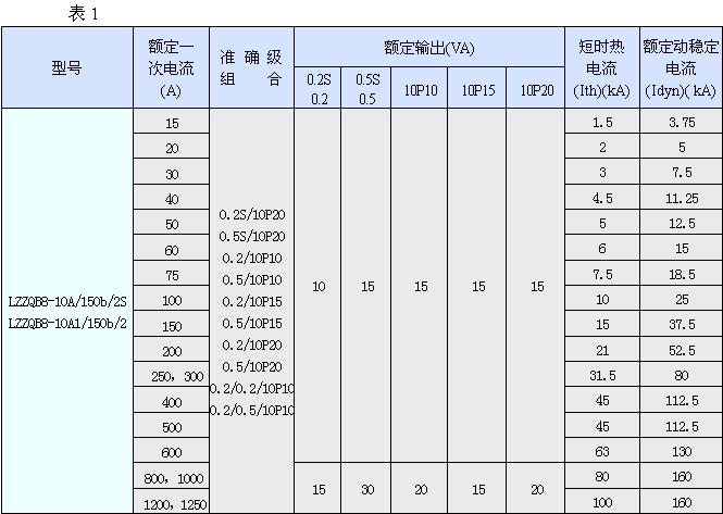 3、额定一次电流、准确级组合、额定输出及动、热稳定电流见表1-5